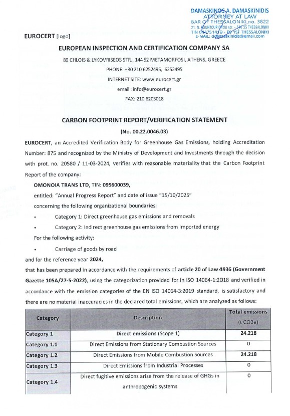 αποτυπώματος έτους 2022 - Η εταιρία ΟΜΟΝΟΙΑ ΤΡΑΝΣ Ε.Π.Ε. στα πλαίσια της Κοινωνικής Εταιρικής Ευθύνης ως υπόχρεα να εφαρμόσει τις απαιτήσεις του άρθρου 20 του Ν. 4936 (ΦΕΚ 105Α/27-5-2022 Εθνικός κλιματικός νόμος) έχει αναπτύξει σύστημα υπολογισμού των εκπομπών αερίων του θερμοκηπίου (GHG) κατηγορίας 1 και 2 που εκπέμφθηκαν κατά τη διάρκεια του έτους 2022 λόγω των επιχειρηματικών δραστηριοτήτων της, οι οποίες έχουν υπολογιστεί σύμφωνα με τις απαιτήσεις του άρθρου 20 του Εθνικού Κλιματικού Νόμου (Ν. 4936/2022) και του διεθνούς προτύπου EN ISO 14064‑1:2019.